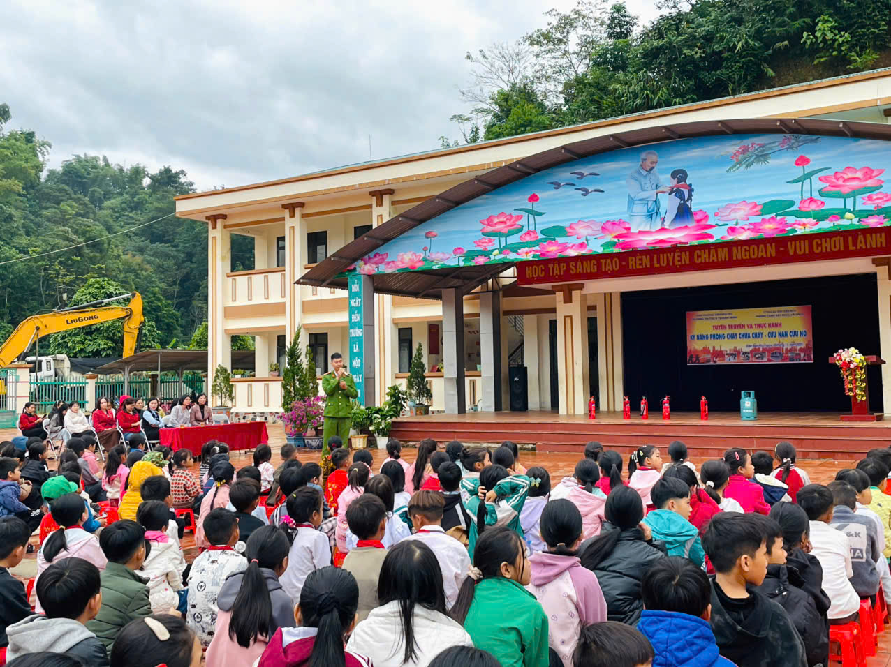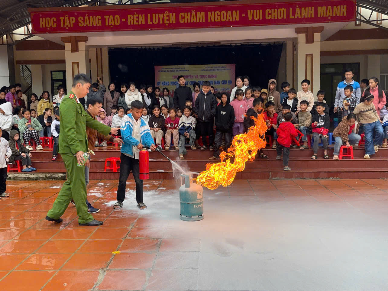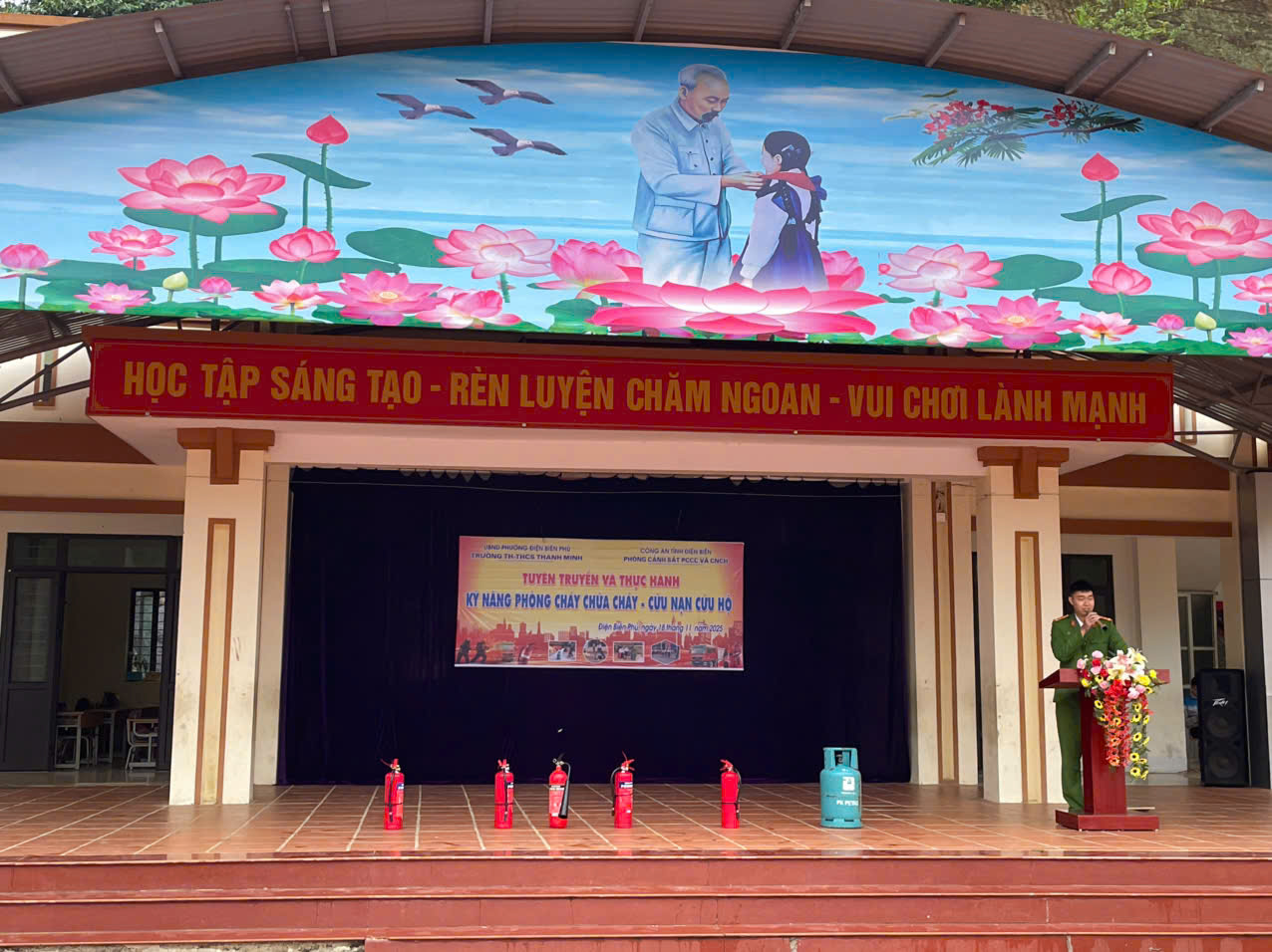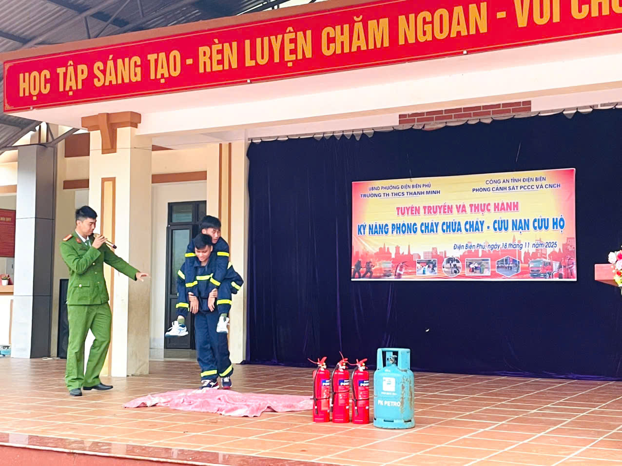 Sáng ngày 18/11/2025, trường TH-THCS Thanh Minh phối hợp với Phòng Cảnh sát PCCC và CNCH tỉnh Điện Biên tổ chức buổi tuyên truyền, hướng dẫn và thực tập phương án chữa cháy – cứu nạn, cứu hộ cho hơn 400 cán bộ, giáo viên, nhân viên và học sinh. Buổi hoạt động do đ/c Nguyễn Thế Hoàn – Phó Đội trưởng Phòng Cảnh sát PCCC trực tiếp chỉ đạo, hướng dẫn.
