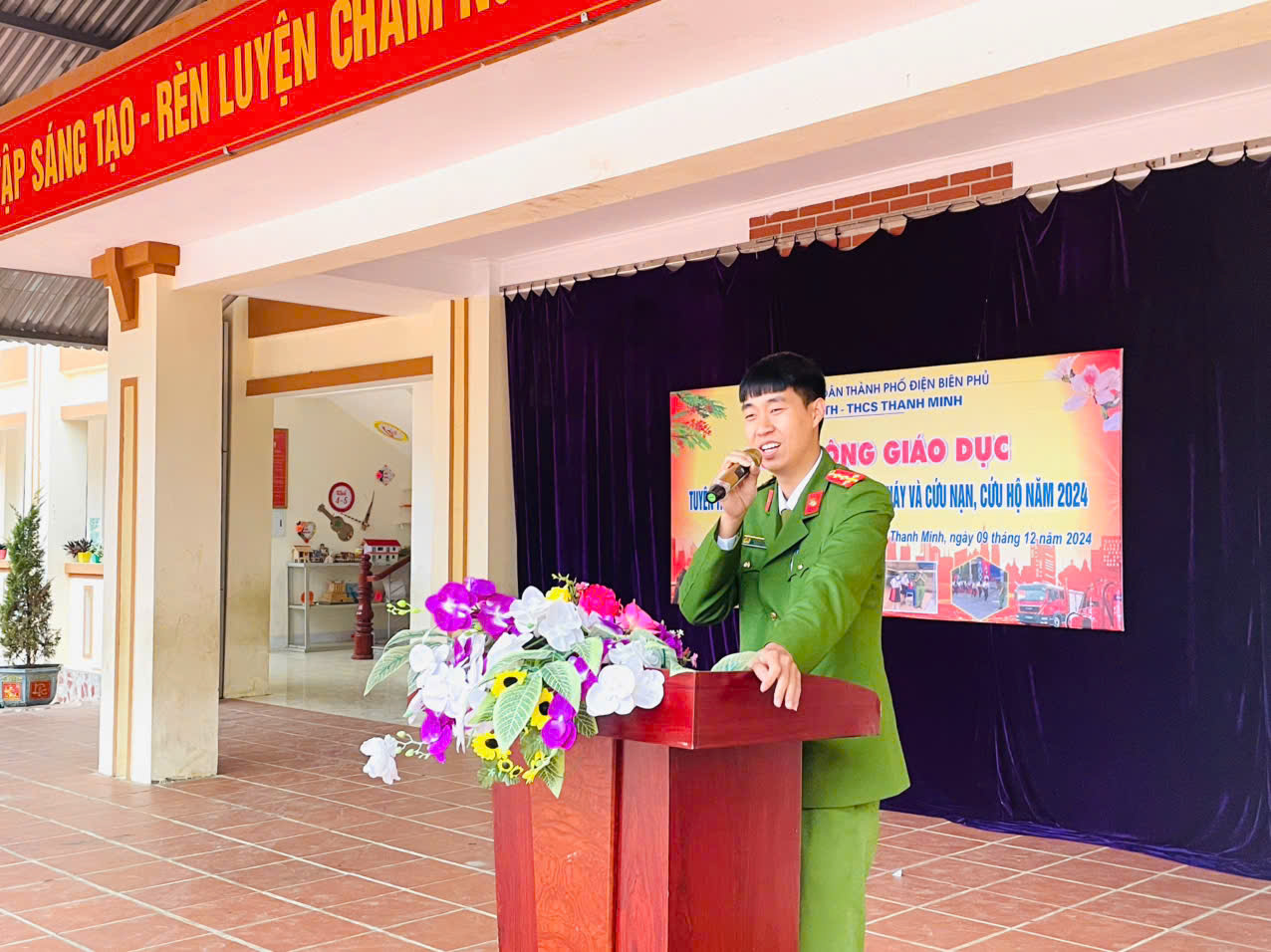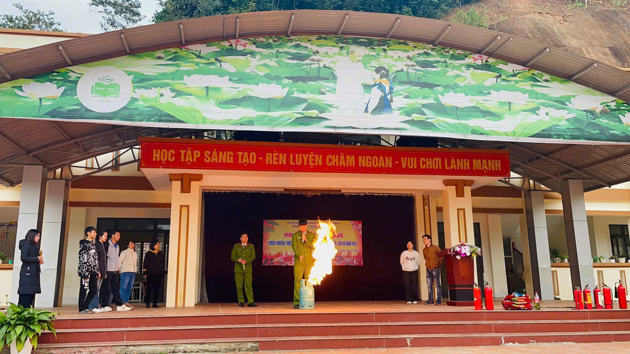 Sáng ngày 09/12/2024, trường TH-THCS Thanh Minh phối hợp với Phòng Cảnh sát PCCC và CNCH tỉnh Điện Biên do đ/c Nguyễn Thế Hoàn - Phó đội trưởng phòng Cảnh sát PCCC và CNCH, đ/c Nguyễn Khánh Hoàn - Cán bộ phòng Cảnh sát PCCC và CNCH thực hiện tuyên truyền, thực tập phương án chữa cháy và cứu nạn, cứu hộ cho hơn 400 cán bộ giáo viên, nhân viên và học sinh nhà trường.