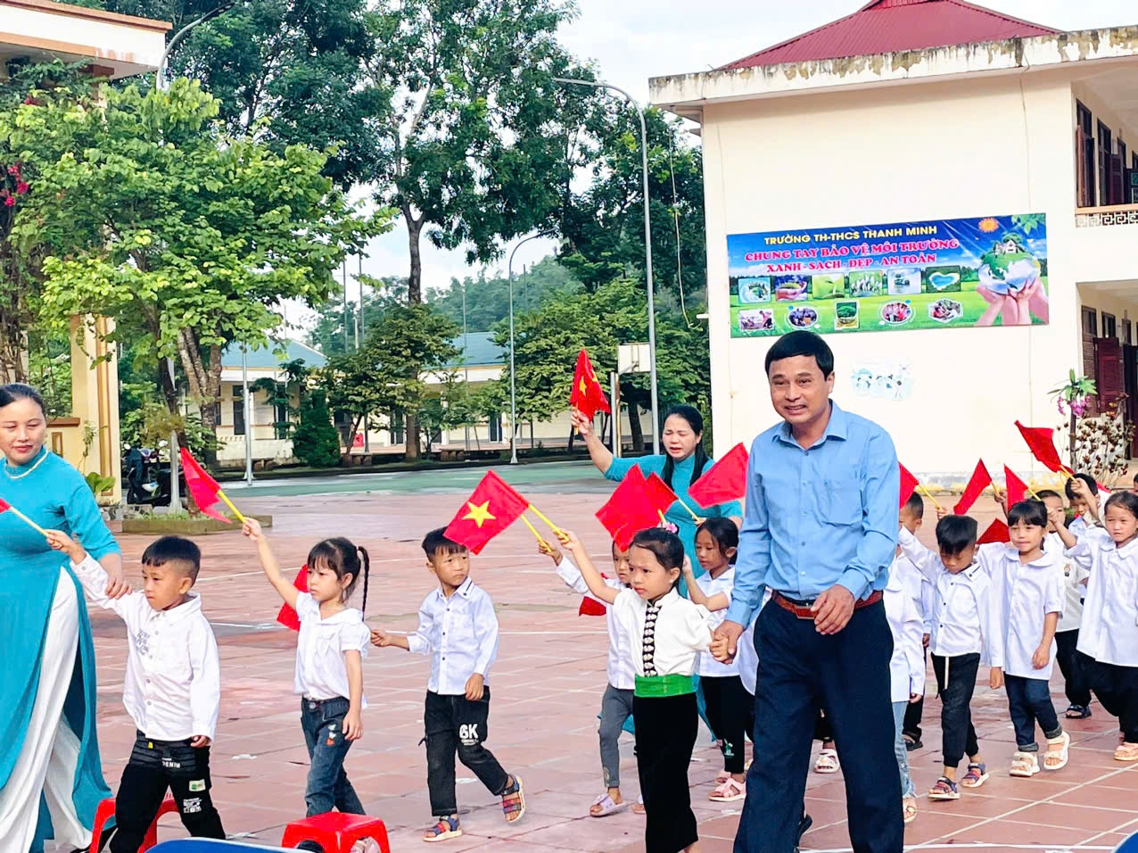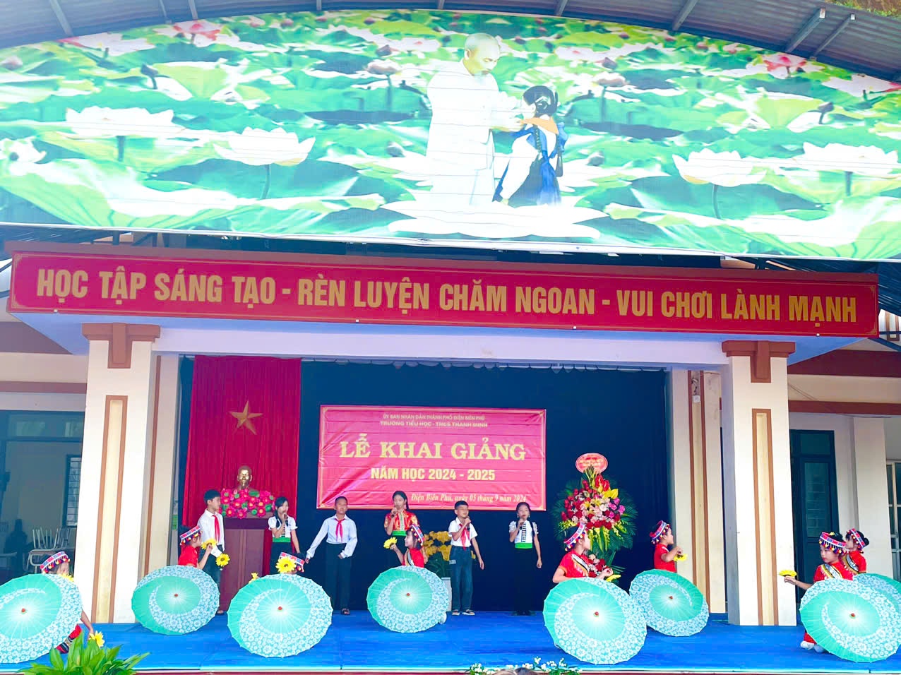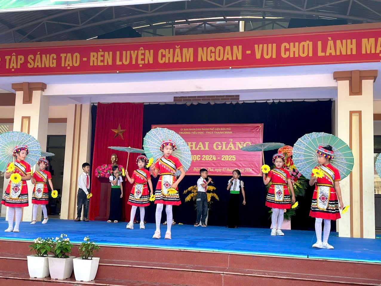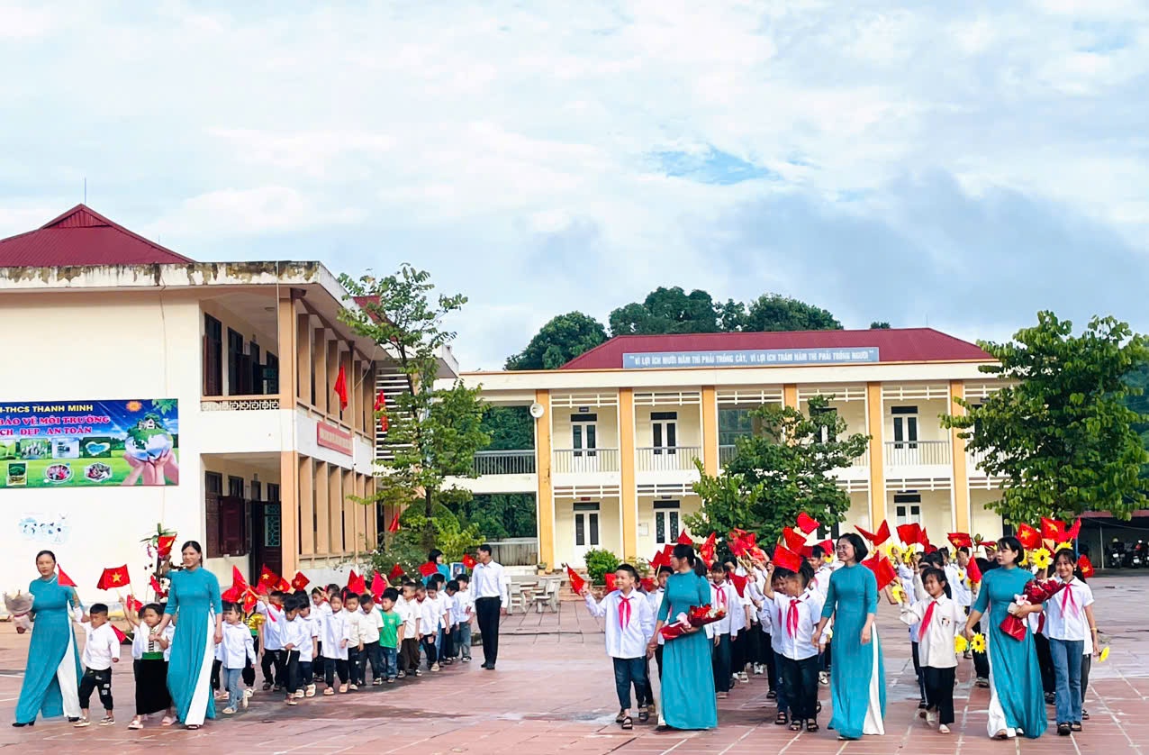 Trong không khí của những ngày thu lịch sử, cả nước hân hoan chào mừng kỷ niệm 79 năm Quốc khánh nước CHXHCNVN (2/9/1945 - 02/9/2024), hòa chung với khí thế tưng bừng, náo nhiệt của tuổi trẻ học đường, cả nước chào đón năm học mới. Ngày 05/09/2024, trường TH-THCS Thanh Minh long trọng tổ chức Lễ khai giảng năm học mới: 2024-2025. Đến dự lễ khai giảng của nhà trường có đồng chí Nguyễn Quốc Tân - Ủy viên BCH Đảng Bộ thành phố, Bí thư Đảng ủy xã Thanh Minh; đồng chí Lò Thị Hà Phó chủ tịch UBND xã và các đoàn thể xã Thanh Minh; các đồng chí thuộc đơn vị kết nghĩa; đại diện ngân hàng Viettinbank; Ban đại diện cha mẹ học sinh và hơn 380 em học sinh trong toàn trường. Tại lễ khai giảng đồng chí Nguyễn Quốc Tân - Ủy viên BCH Đảng Bộ thành phố, Bí thư Đảng ủy xã Thanh Minh đã đọc thư của Chủ tịch nước Tô Lâm gửi ngành Giáo dục nhân dịp khai giảng năm học mới 2024-2025. Năm học 2023 – 2024, nhà trường đã hoàn thành tốt nhiệm vụ năm học, có thành tích trong thực hiện nhiệm vụ, được UBND Thành phố tặng giấy khen. Phát huy những thành tích đạt được, trong năm học 2024-2025 với chủ đề: “Đoàn kết, kỷ cương, trách nhiệm, đổi mới sáng tạo, nâng cao chất lượng giáo dục và đào tạo” tập thể cán bộ giáo viên, nhân viên và các em học sinh trường TH - THCS Thanh Minh quyết tâm triển khai nghiêm túc nhiệm vụ năm học và các văn bản, chỉ thị của các cấp, các ngành, hoàn thành tốt nhiệm vụ năm học. Các em học sinh khó khăn trong nhà trường luôn nhận được sự quan tâm, động viên của các nhà hảo tâm, các đơn vị tài trợ khích lệ tinh thần hiếu học và tiếp thêm động lực cho học sinh khó khăn trên con đường đến trường. Tiếng trống trường đã vang lên rộn rã hứa hẹn một năm học với những thành công mới, những thách thức mới cùng một quyết tâm hoàn thành xuất sắc nhiệm vụ năm học. Lễ khai giảng năm học mới 2024 – 2025 diễn ra trong bầu không khí trang nghiêm nhưng cũng không kém phần vui tươi, phấn khởi. Với điệu xòe đoàn kết, thân ái kết nối các vị đại biểu, thầy giáo, cô giáo và các em học sinh trong toàn trường đã khép lại một Lễ khai giảng thành công, hứa hẹn một năm học mới nhiều thắng lợi mới./.