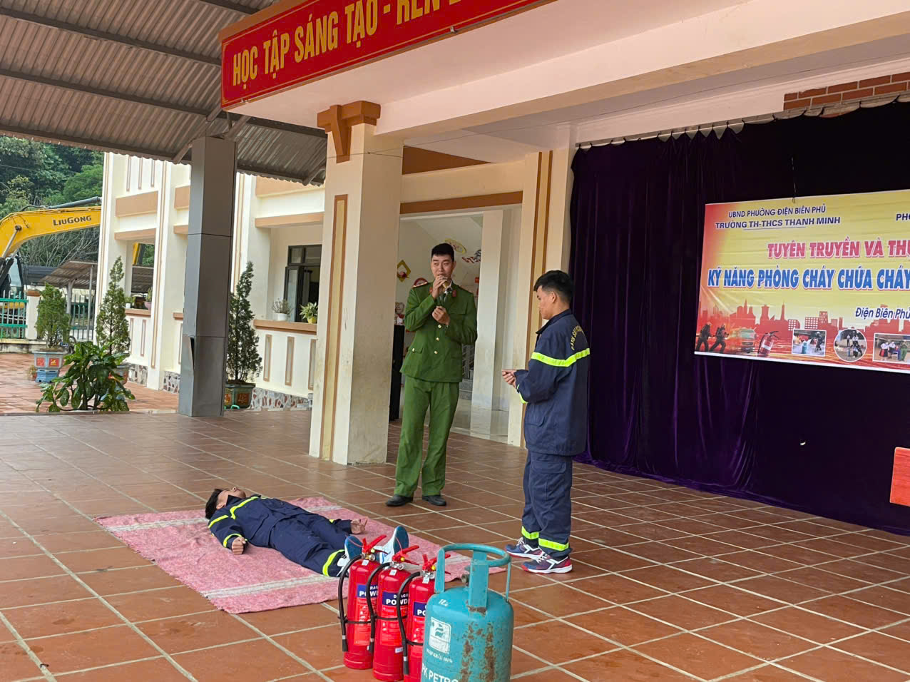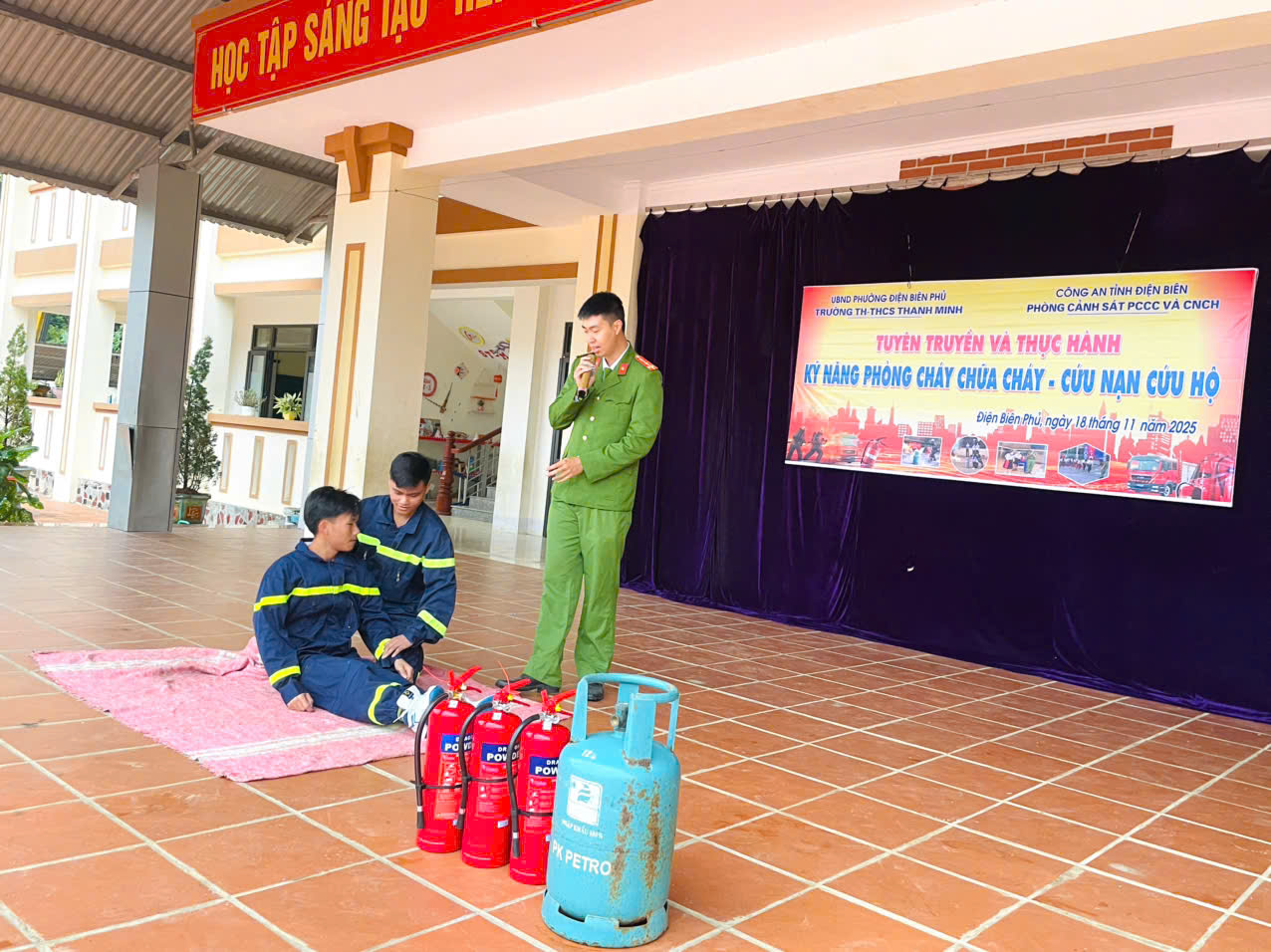 Sáng ngày 18/11/2025, trường TH-THCS Thanh Minh phối hợp với Phòng Cảnh sát PCCC và CNCH tỉnh Điện Biên tổ chức buổi tuyên truyền, hướng dẫn và thực tập phương án chữa cháy – cứu nạn, cứu hộ cho hơn 400 cán bộ, giáo viên, nhân viên và học sinh. Buổi hoạt động do đ/c Nguyễn Thế Hoàn – Phó Đội trưởng Phòng Cảnh sát PCCC trực tiếp chỉ đạo, hướng dẫn.