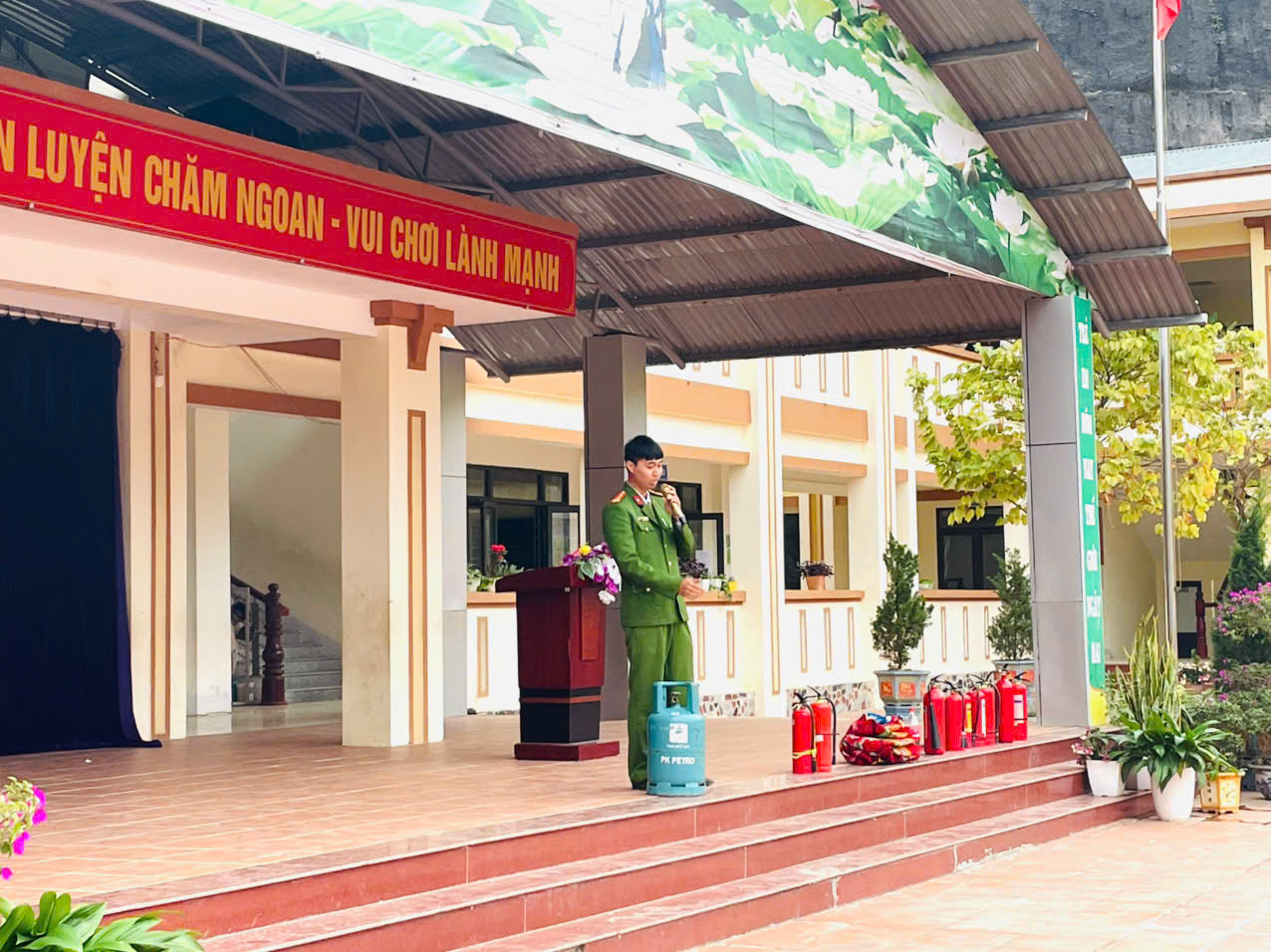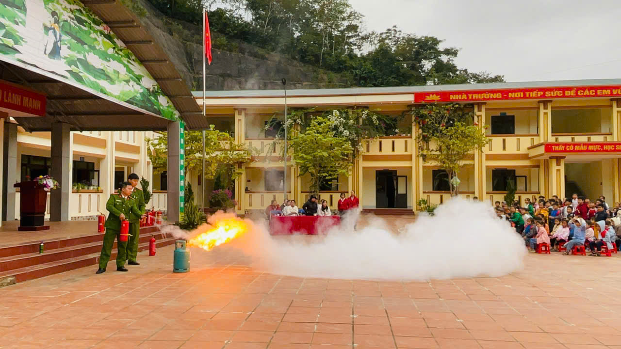 Tại buổi tuyên truyền, thực tập phương án, cán bộ, giáo viên, nhân viên, học sinh nhà trường được hướng dẫn cách sử dụng một số phương tiện chữa cháy tại chỗ như: bình chữa cháy xách tay, trực tiếp sử dụng bình chữa cháy để dập tắt bình gas và thiết bị mô phỏng đang bị cháy; trang bị cho cán bộ giáo viên và học sinh các kỹ năng cơ bản như nhận biết lối thoát hiểm gần nhất, cúi thấp người khi di chuyển qua khu vực có khói để tránh hít phải khí độc, cách dùng khăn ướt để che miệng và mũi khi thoát hiểm, giúp các em học sinh giữ được bình tĩnh và làm theo chỉ dẫn của người lớn hoặc lực lượng cứu hỏa.
