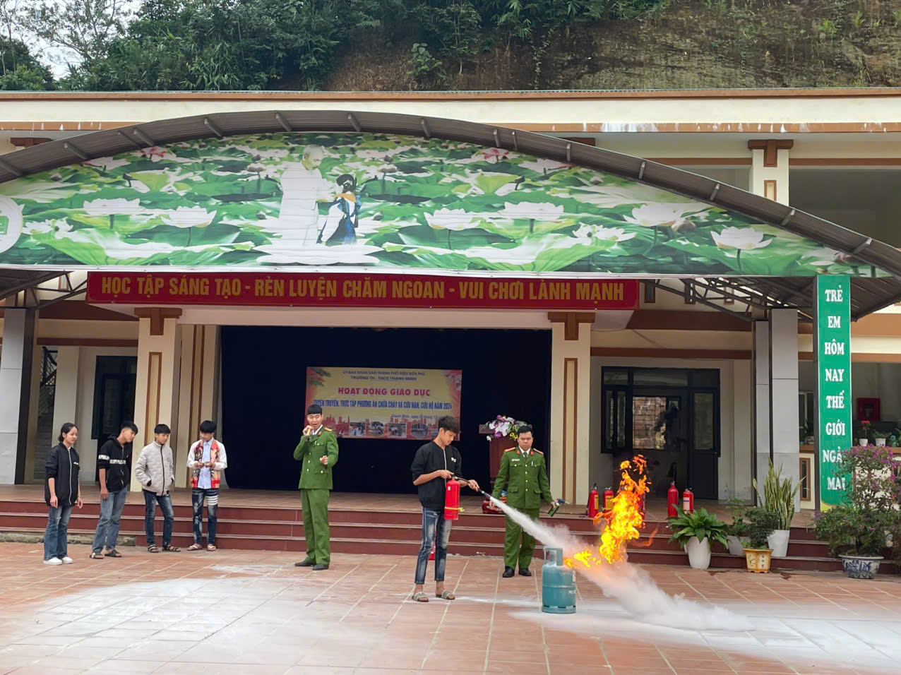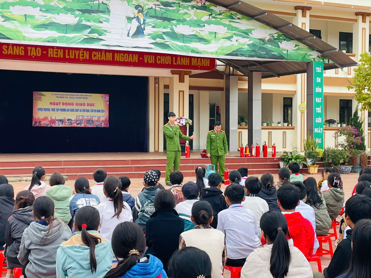 Sáng ngày 09/12/2024, trường TH-THCS Thanh Minh phối hợp với Phòng Cảnh sát PCCC và CNCH tỉnh Điện Biên do đ/c Nguyễn Thế Hoàn - Phó đội trưởng phòng Cảnh sát PCCC và CNCH, đ/c Nguyễn Khánh Hoàn - Cán bộ phòng Cảnh sát PCCC và CNCH thực hiện tuyên truyền, thực tập phương án chữa cháy và cứu nạn, cứu hộ cho hơn 400 cán bộ giáo viên, nhân viên và học sinh nhà trường.